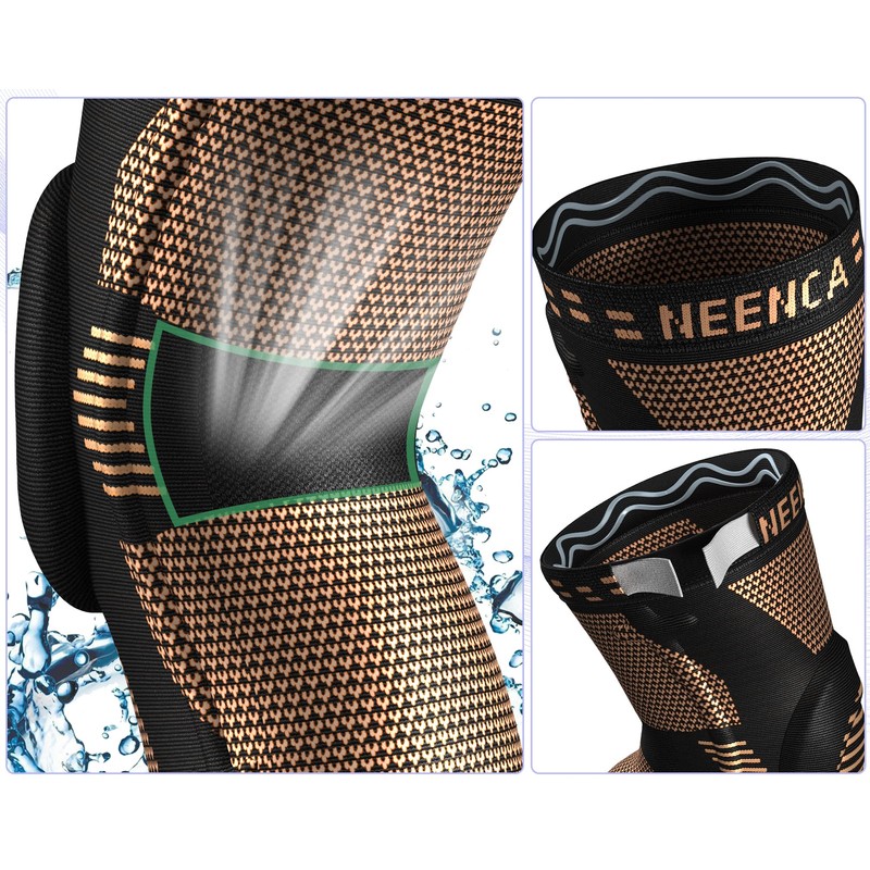- EXCLUSIVE PATENT— NEENCA Copper Ions Infused Technology: Real 60% Copper Ions Infused Fiber + 21% Nylon +16% Polyester. Spring knee support technology: An anatomically contoured patella gel pad surrounds the kneecap, dual metal spring stabilizers fit tightly with your knee joint. These special functional elements strengthen side support and maintain joint stability. It effectively disperses pressure, keeping knee warm, lubricating your joints. BEST CHOICE for sports protection and pain recovery.