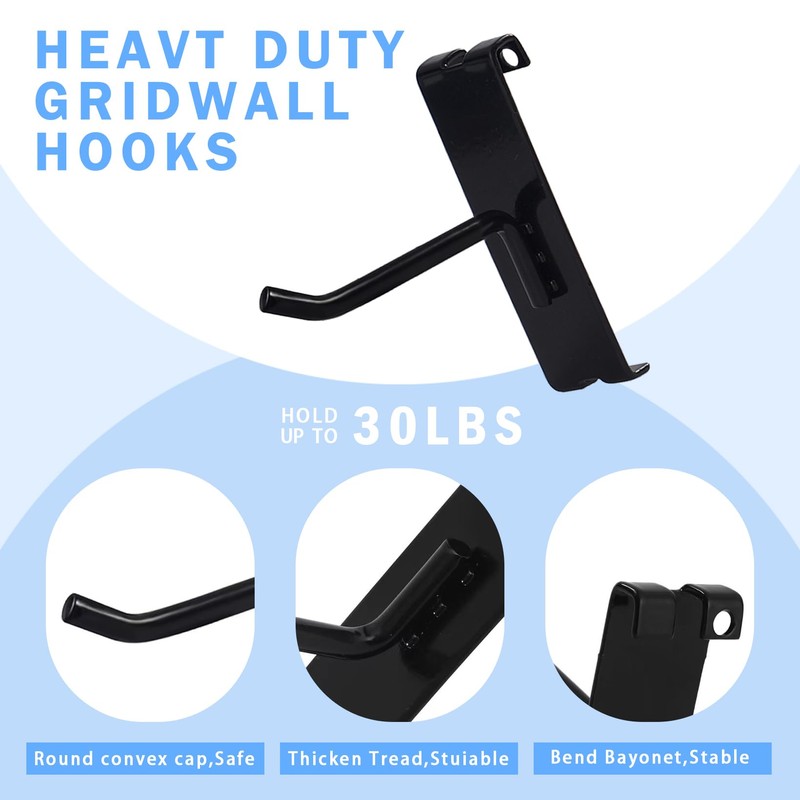 - Sturdy & Durable Design: Made of high-quality stainless steel with a rust-resistant lacquer coating, and the hook rod is 0.2'' in diameter. gridwall hooks deliver exceptional strength and long-lasting performance. Each hook securely holds up to 30 pounds, providing reliable support for heavy-duty items