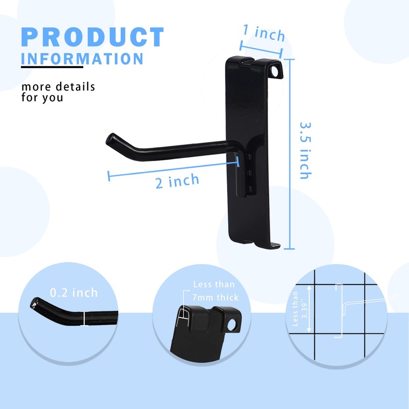 - 2 Inch Gridwall Hooks Set: Including 100 pcs 2 inch length grid wall hooks provide a robust solution for organizing and displaying a wide range of items on your gridwall panels.Our display hooks are compatible with standard 3" x 3" grid walls for easy installation and versatility