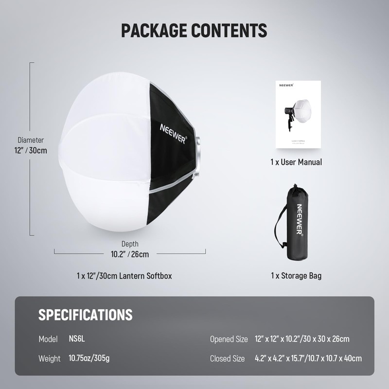 - 【Package Contents】 1 x 12"/30cm Lantern Softbox, 1 x Storage Bag, 1 x User Manual
