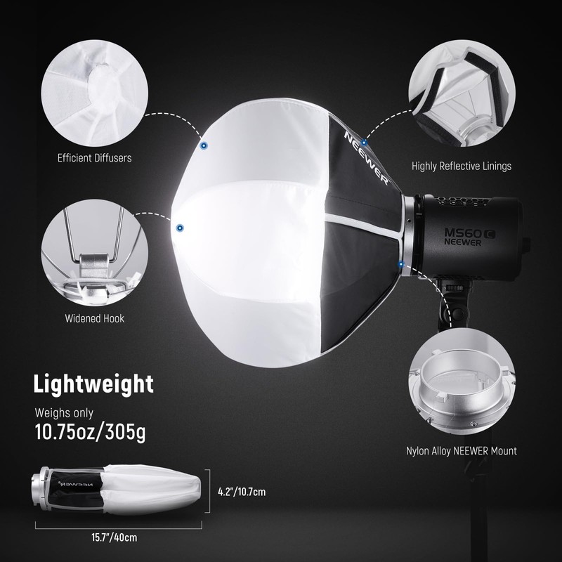 Easily mount the lantern softbox onto NEEWER MS60 MS60B MS60C MS150B continuous video lights, allowing seamless switches between NEEWER light modifiers and accessories with NEEWER mount adapters. Its nylon alloy construction also makes the softbox lighter—only 10.75oz/305g with the storage bag included.