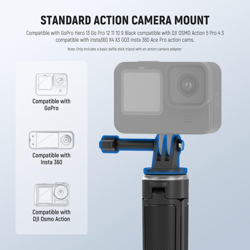 - 【Tripod Stand for Action Camera】 Mount the action camera adapter via the top 1/4" screw, compatible with GoPro Hero 13 Go Pro 12 11 10 9 Black compatible with DJI OSMO Action 5 Pro 4 3 compatible with Insta360 X4 X3 GO3 Insta 360 Ace Pro action cams compatible with DJI Osmo Pocket 3 handle, etc. You can also attach a phone holder or other photography and videography accessories, gears, or equipment like a monitor, fill light, or microphone (all not included) for versatile use
