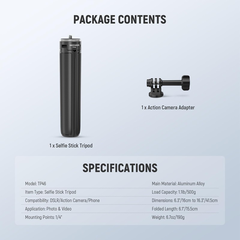 The NEEWER Basic mini desktop selfie stick tripod is a versatile and practical tool designed for content creators, featuring a simple and economical design that emphasizes essential functions. Made from premium aluminum alloy, it can be used as either a tabletop tripod or a handheld stabilizer, supporting action cameras and smartphones with a maximum load of 1.1lb (500g). Its height is adjustable from 6.3" to 16.3", and it includes a 180° tilt adapter for optimal viewing angles. Lightweight at just 6.7oz and compact when folded, it is ideal for outdoor shooting, travel, and various filming needs.
