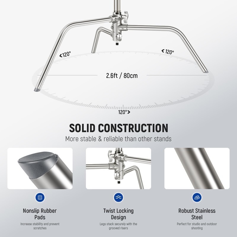 - 【Introducing NEEWER BASICS】 Simple and practical, NEEWER Basic is an economical product line that focuses on essential functions and designs, without unnecessary extras and materials. The SC320 Lite is a heavy duty C stand made from stainless steel, equipped with a sturdy boom arm and two grip heads to securely hold various heavy photography equipment for different setups and effects. Its metal turtle base ensures solid support without wobbling