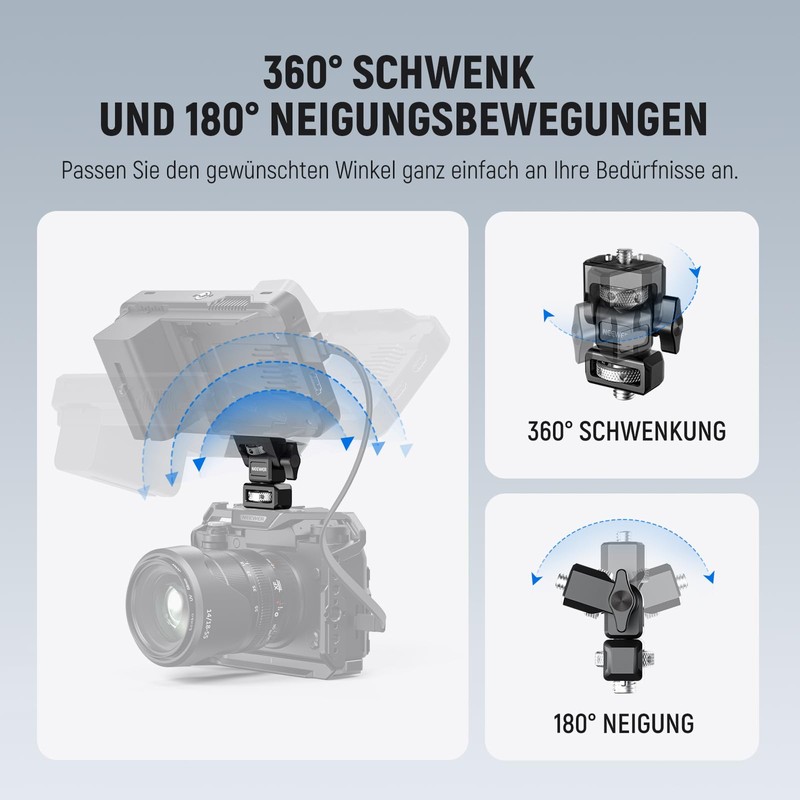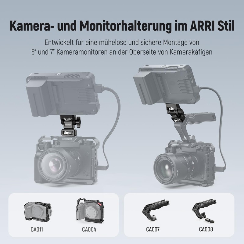 - Camera monitor mount in ARRI style: Designed for effortless and secure mounting of 5 inch and 7 inch camera monitors at the top of the camera cage (such as NEEWER CA011, CA004, CA002). The lower 3/8" thumb screw with ARRI fixing pins can be easily tightened by hand. Seamless compatibility with SmallRig camera cages, video rigs, top handle and other accessories