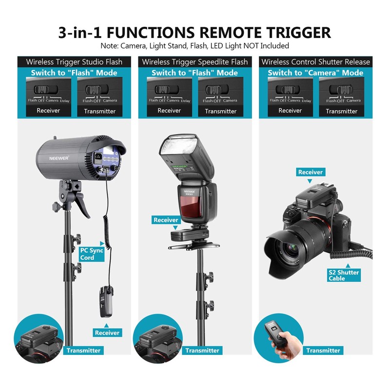- 3 in 1 functions remote shutter: (1) Can be used as a wireless synchronous trigger for studio strobe flashes, e.g. B. Neewer N-250W, N-300W, S-400N, Q-600N flash; (2) It can be used as a wireless speedlite flash; (3) It can also be used as a wireless camera shutter release