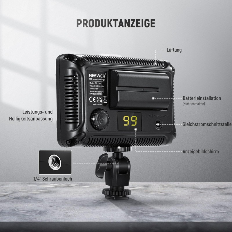 - Note: power supply, cable and battery are not included; 176 ultra bright LED bulbs: with 176 individual long lasting LED bulbs, this light provides a wider beam range and illuminates continuous daylight compensation at 5600K