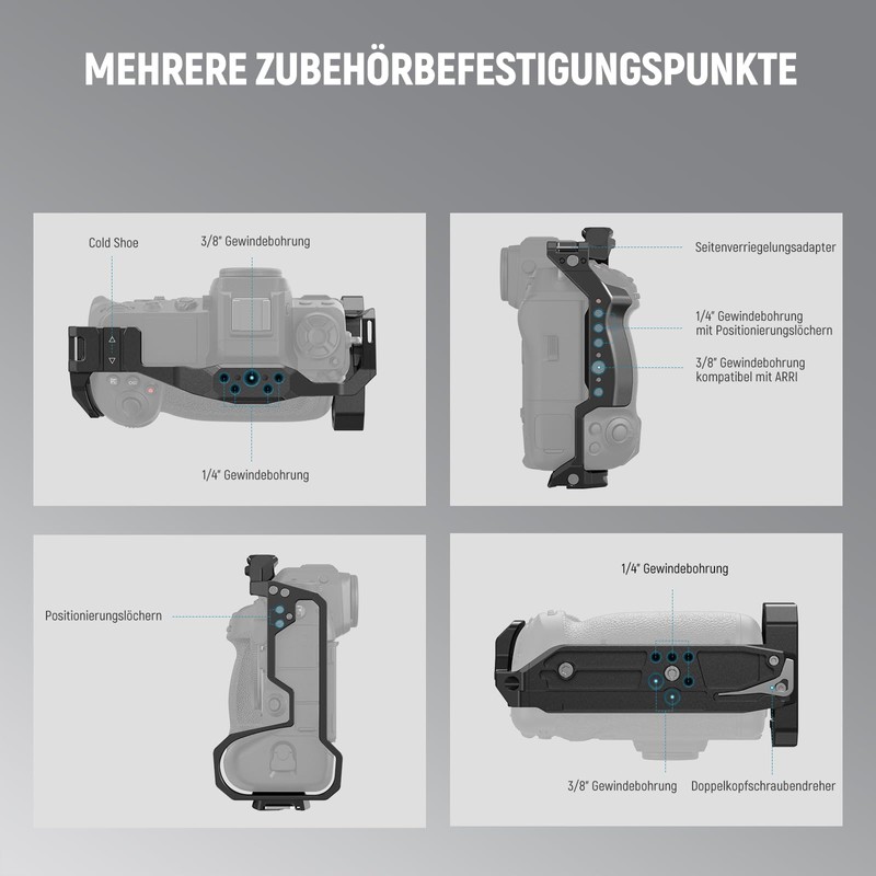 - Multiple attachment points: Multiple 1/4 inch and 3/8 inch threads with positioning pins, an integrated NATO rail and a hot shoe allow you to equip the cage with LED lights, microphones, top handles, monitor holders and magic arms for extended functionality