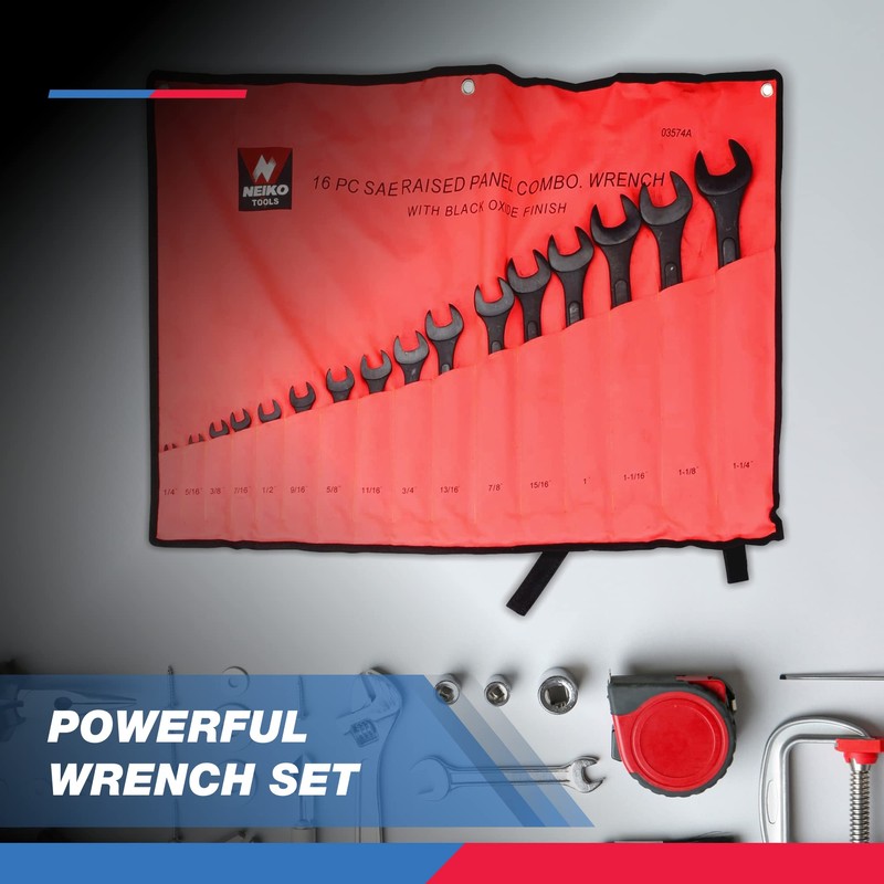 The Neiko 03575 Combination Wrench Set contains a versatile selection of the most commonly used sizes and conveniently stored in a labeled pocket tool bag. This 16-piece set is constructed of heavy duty steel with a raised panel design for extra power. Two sided ends provide a 15 degree offset offering increased clearance and minimizes slippage when used on hard to remove fasteners.