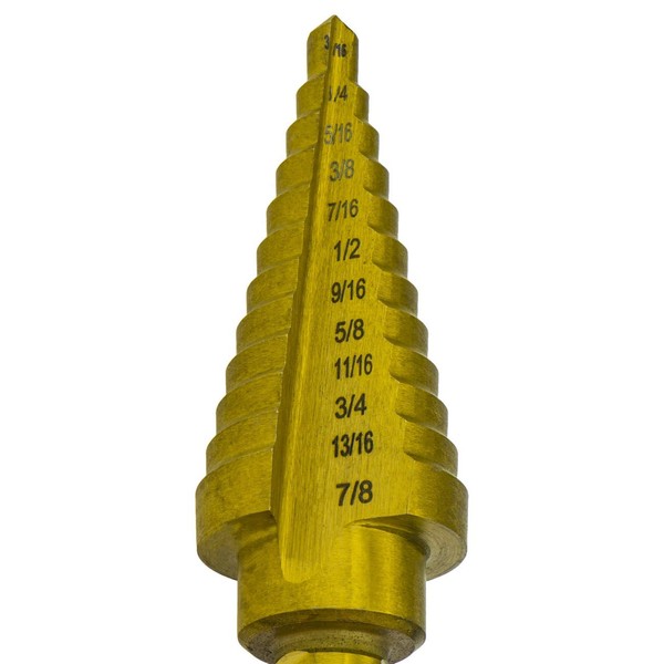 Neiko 10185A Titanium Step Drill Bit, 3/16" - 7/8" in 1/16" Increments. with heat treated high-Speed-Steel (HSS bits) coated with titanium nitride