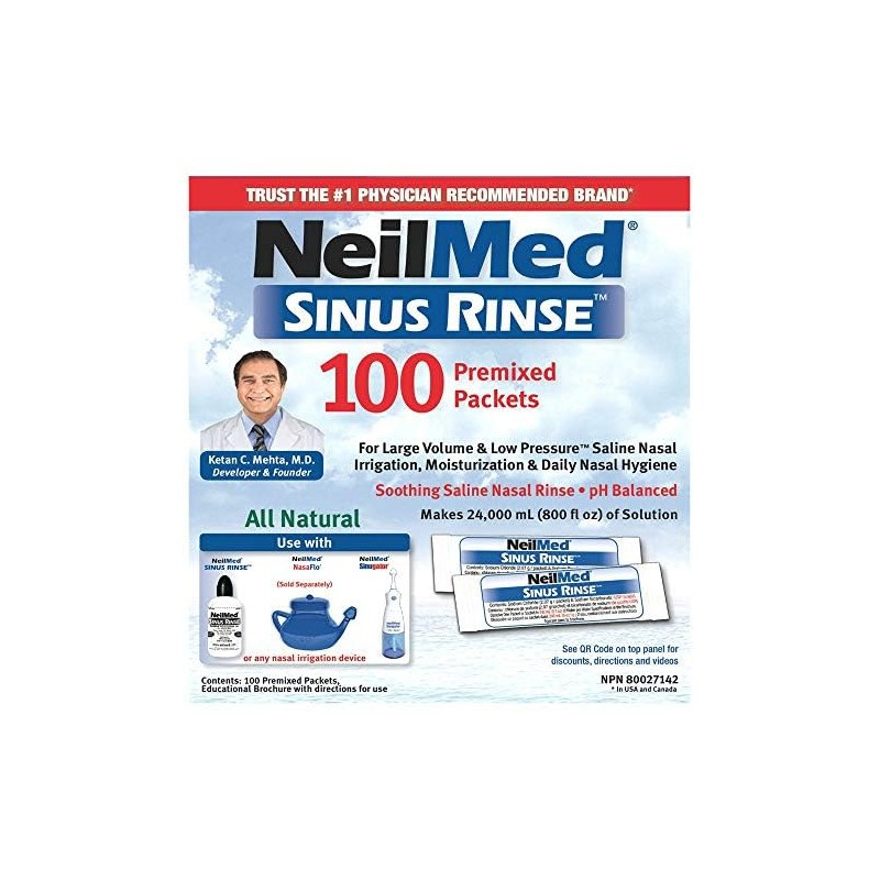 NeilMed Sinus Rinse 100 Refill Packets is a natural soothing saline nasal wash used with NeilMed's Sinus Rinse Kit, NasaFlo Neti Pot or Sinugator. A large volume low positive pressure nasal wash is the most effective way to irrigate the nose based on current medical studies. Daily rinsing is safe and will keep your nasal passages clean, healthy and open. It is available in isotonic, pediatric and hypertonic concentrations.