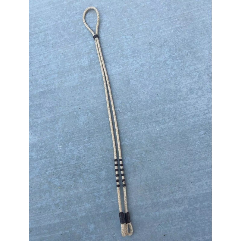 SET OF NATURAL WITH DARK BROWN RAWHIDE HORSE REINS AND QUIRT. 34 INCHES LONG.