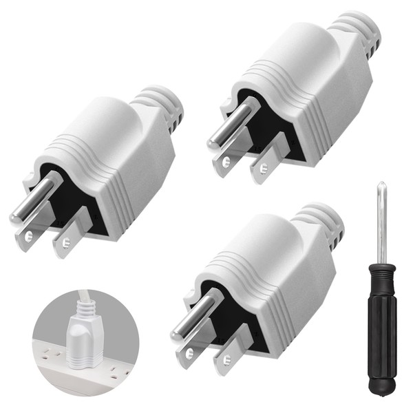 Nema 5-15P Electrical Replacement Plugs End, 3 Pack Extension Cord Ends, Replacement Plug 3 Prong with 1 Screwdriver, Neutral Ground Bonding Plug, 3 Wire Male Plug, Power Plug Replacement, White