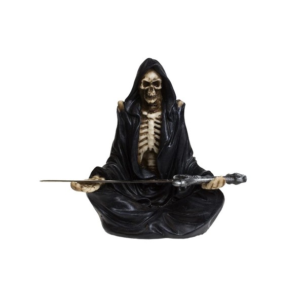 This figurine would make the ideal addition to any corporate goth's office. Sitting, cross-legged on the ground, This Reapers cloak drapes down, showing his skeletal frame. Laying on his outstretched hands is a large sword, used for opening your letters Cast in the finest resin before being expertly hand-painted, this piece will add a sinister Aura to your space.