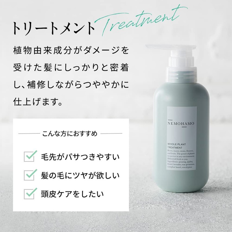 • Whole Plant Treatment Plant-derived ingredients adhere firmly to damaged hair, giving you a glossy finish while repairing them. Enjoy relaxing with a deep and transparent fragrance that will blend with lavender and geranium. No petroleum ingredients, non-silicone formula. It will be more effective if used continuously with NEMOHAMO shampoo