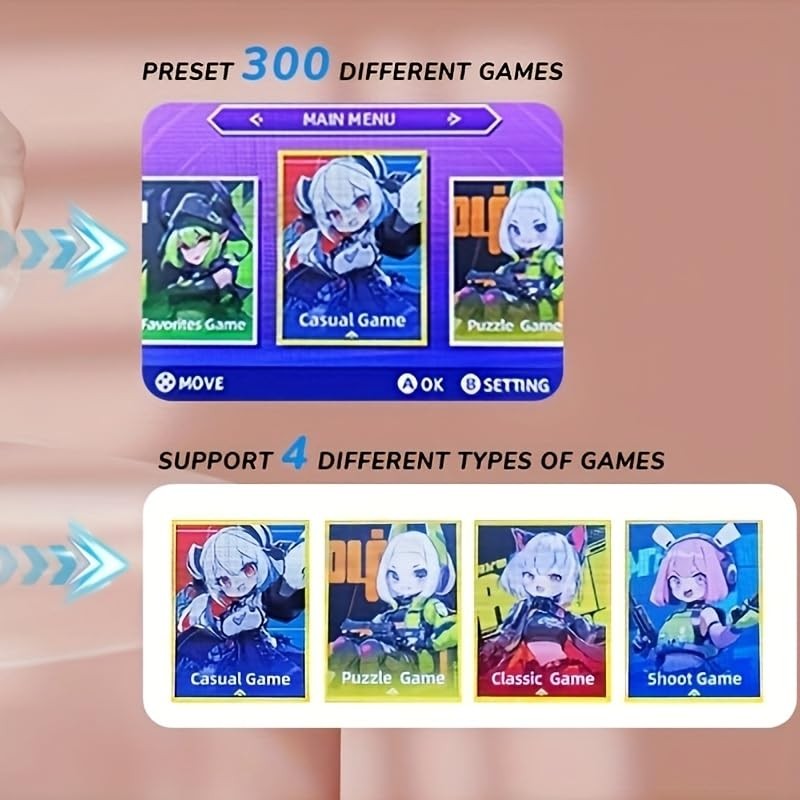 [300 Preloaded Retro Handheld Game Console]: Retro gaming console handheld that offers 300 built-in licensed games, various retro games, including 87 Casual Games, 39 Puzzle Games, 11 Shoot Games, 163 Classic Games. Licensed classic games often include quality-of-life improvements like save states, rewind features, and customizable controls, making them more accessible without losing their retro charm. They bridge the gap between older and newer generations of gamers, allowing families and friends to share the joy of retro gaming console games.