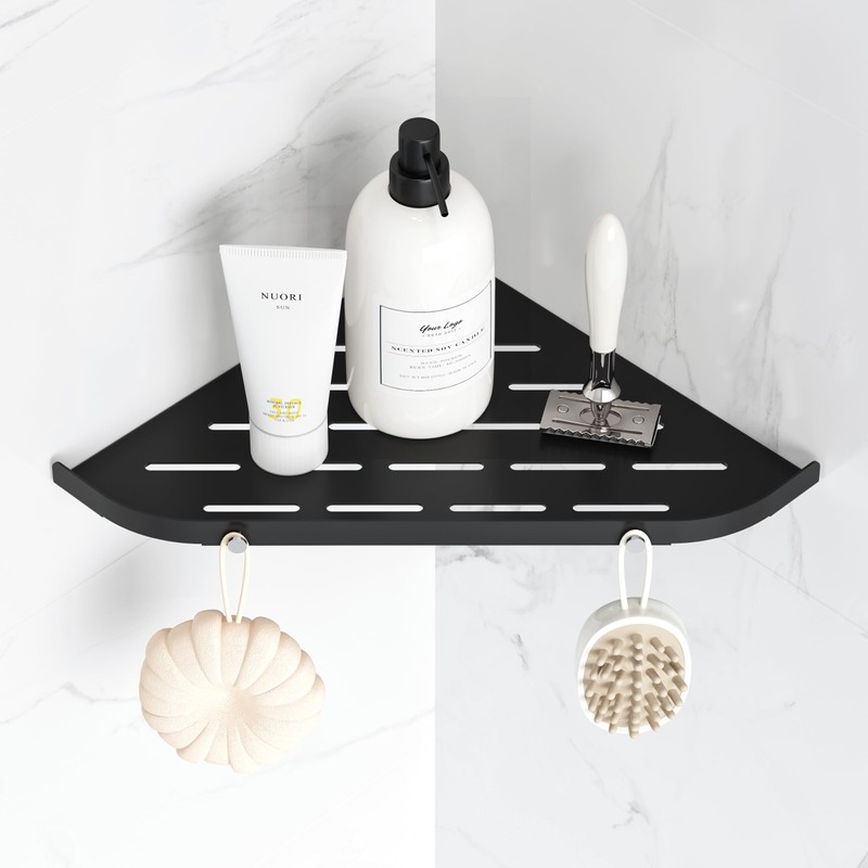 - Space Saving The recessed triangular shower caddy is rotated 90° and can be used to store household items such as shampoo, shower gel and spice bottles. The additional hooks can be hung small items to organise the room