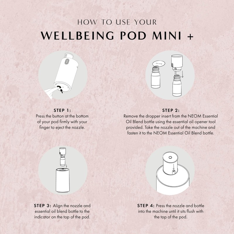- HOW TO USE – Simply attach your NEOM Essential Oil to your Wellbeing Pod Mini+, using cold fusion technology, essential oil is converted into micro fine vapour, without using heat or water, and released into the atmosphere to stimulate your senses and boost your wellbeing.