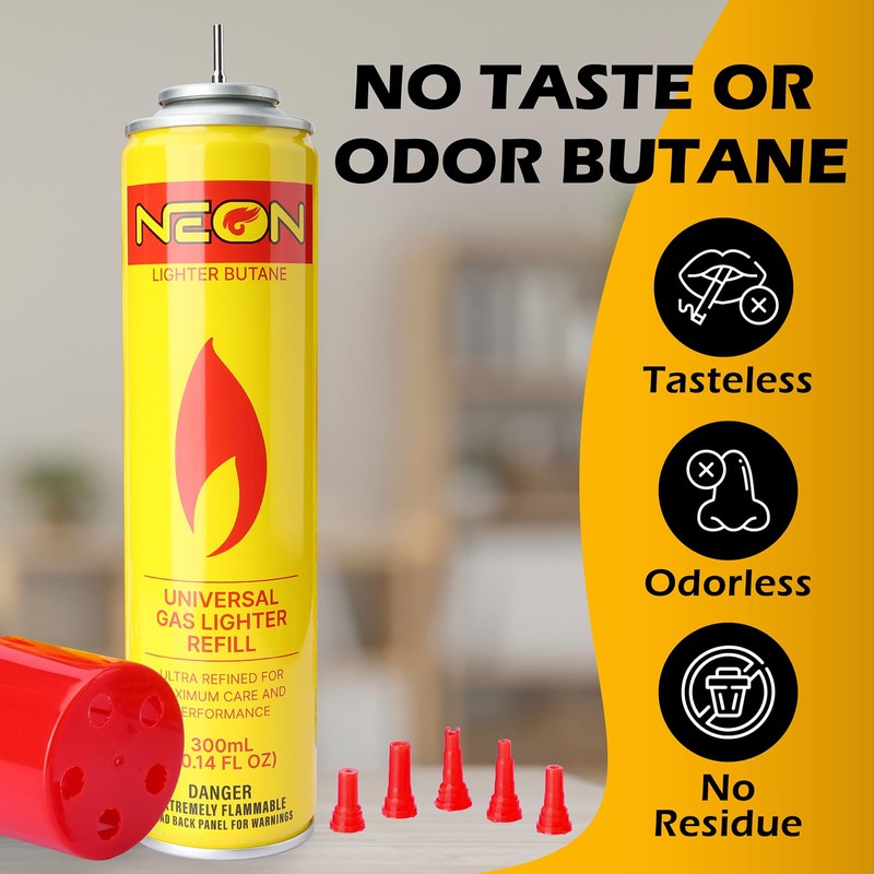 NEON Butane Fuel Refill, 300ml Ultra Refined Lighter Fluid, Premium 99.999% Pure Butane Gas with Metal Nozzle and 5 Butane Adapter Tips for Torch Lighter, Kitchen Torches, Refillable Lighters, 1 Can
