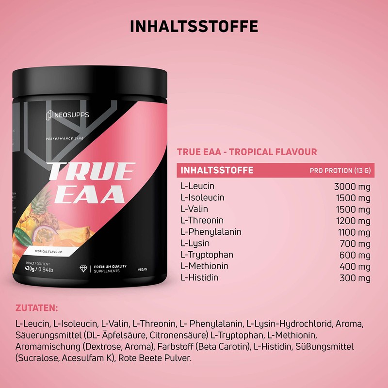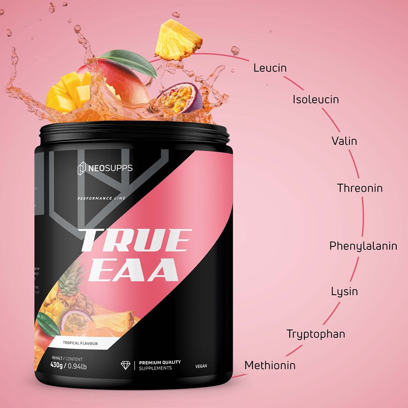 NEOSUPPS EAA Powder - Tropical, 430 g, High-Quality Essential Amino Acids for Before & During Training, High Dose (10,300 mg EAAs per Serving) & Enriched with L-Histidine