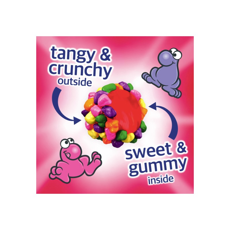 Tangy and crunchy outside, sweet and gummy inside. Rainbow Nerds surround fruity gummy centres. Those sweet little sparks are fantastic inventions. A poppable cluster, packed with tangy, crunchy Nerds. A candy so tasty, there aren't even words!