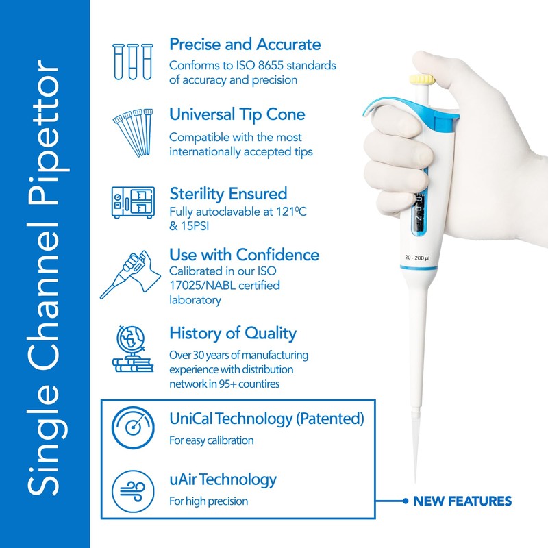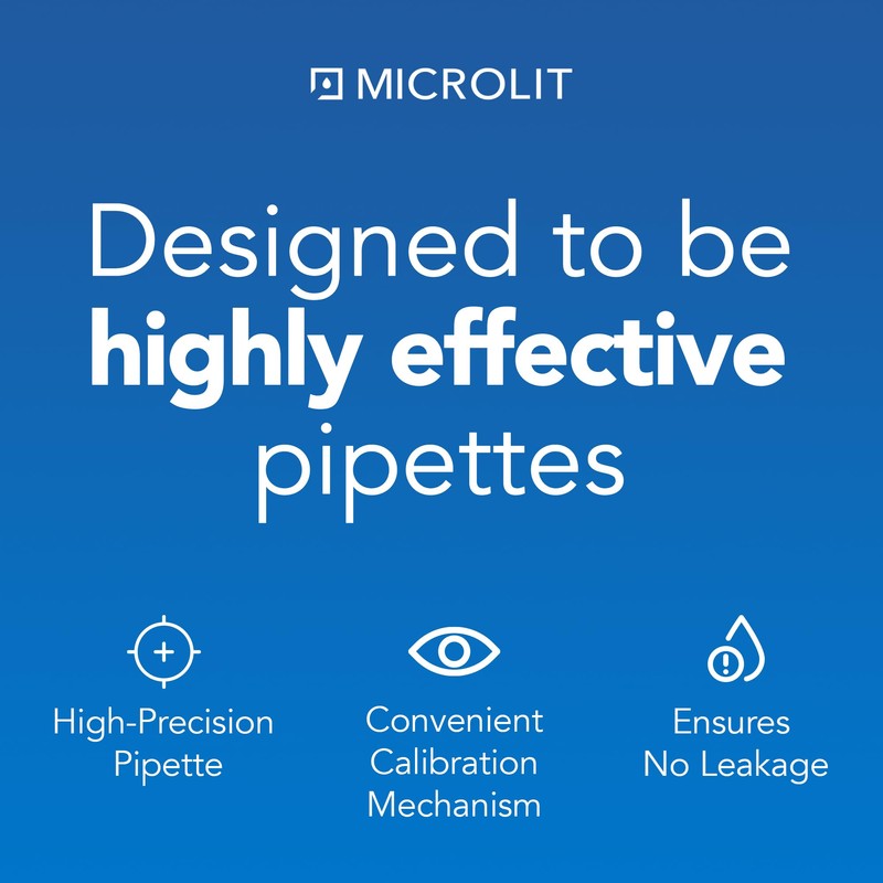 The Microlit NERO Micropipette is an ergonomic single-channel, variable-volume micropipette designed to meet the highest standards of precision and convenience in laboratory settings. Utilizing advanced technologies such as UniCal and µAir, these micro pipettes ensure exceptional accuracy for your pipetting tasks. Our fully autoclavable micropipettes come equipped with a tip ejector, making them easy to use and maintain. From plastic pipettes to glass pipettes, and from mini pipettes to large pipettes, our range accommodates various needs, including 5ml pipettes and 10ml pipettes, making them ideal for any lab requirement. Whether you're handling disposable pipettes, laboratory pipettes, or specialized micropipette p1000 and micropipette p20 types, our products are designed for versatility and precision. Since 1991, our team of innovative product design engineers has been dedicated to developing liquid handling instruments known for their accuracy and precision. Our commitment to excellence has resulted in market-leading innovations in bottle-top dispensing technology, earning the trust of professionals in over 95 countries. We offer a complete package that includes a calibrated micropipette, compatible pipettor tips, a calibration tool, an ISO 8655 Calibration Certificate (valid for 1 year), a pipette holder, and a comprehensive user manual. Choose Microlit NERO for all your pipetting needs, whether you're working with small pipettes, long pipettes, or large-volume applications. Trust in our exceptional customer service and join the professionals worldwide who rely on our products for accurate and reliable results. Our micropipette pipettes, pipette tips, and pipettor tips are designed to enhance your laboratory experience, ensuring maximum cleanliness and precision in every use.
