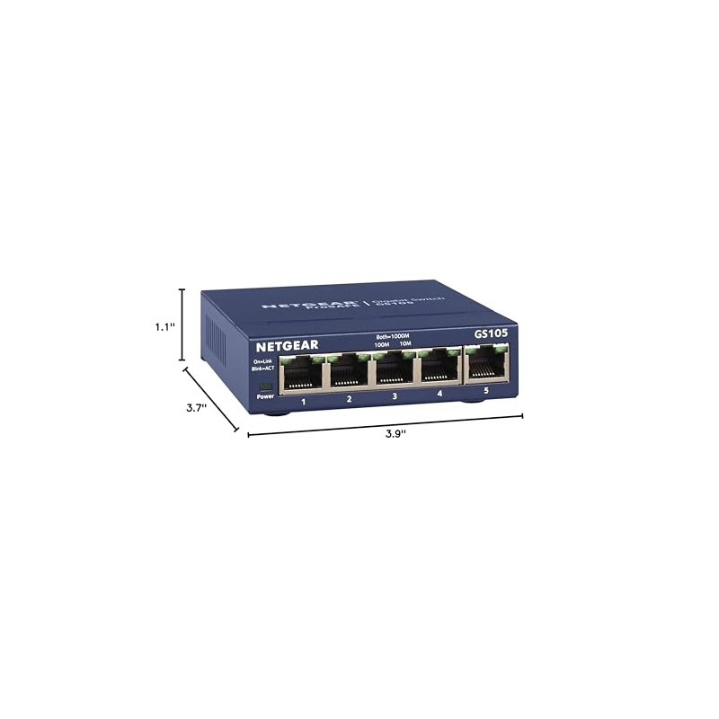 From the ManufacturerMoves huge files fast! Netgear GS105 features five high-speed, auto-switching 10/100/1000 Mbps Ethernet connections and because Gigabit Ethernet is a full duplex standard, you get up to 2000 Mbps on each port. It integrates 10, 100, and 1000 Mbps devices on the same network. Every port automatically senses the right speed and full/half duplex mode, and Auto Uplink technology automatically adjusts for straight-through or crossover cables. Sized to save space, this sturdy, metal 5-port switch is compact and fits easily on a desk or mounts on a wall, making it ideal for home and small office environments.For a high-speed network on a small scale, nothing delivers likes this compact powerhouse. Equipped with five auto-speed-sensing 10/100/1000 Mbps UTP ports, this affordable switch gives your network the capacity to handle huge workloads. It moves very large files across your network instantly, and lets you painlessly integrate 10, 100, and 1000 Mbps devices on your network. Packed with ease-of-use features to simplify your networking experience, its trim design makes it an easy fit for a desk or mounted on a wall. The durable metal chassis protects interior working parts and the fan-less design results in silent operation. Matched with Netgear's thorough testing, the GS105 switch provides long-lasting performance you can count on.Product DescriptionNETGEAR 5-port Gigabit Desktop Switch, designed for business with simple plug-N-play connectivity and no configuration needed. It comes with sturdy metal case and NETGEARs Limited Lifetime* Warranty. It supports Energy Efficient Ethernet (IEEE802.3az) for optimized energy savings and DSCP-based QoS for traffic prioritization.