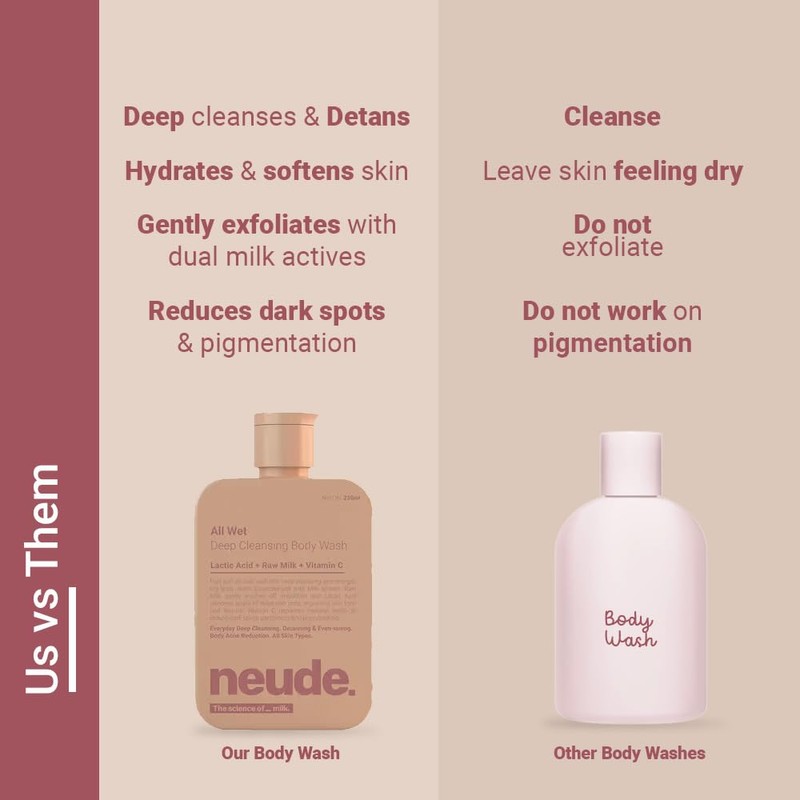 - ACNE-FREE, PORE-SMOOTH BODY SKIN: Milk & Lactic Acid in Neude All Wet Gentle Body Wash give body skin a deep-pore cleanse, taking off & rinsing dirt, dullness, impurities. Every shower with this body wash helps reduce body acne & bumps, making skin smoother over time.