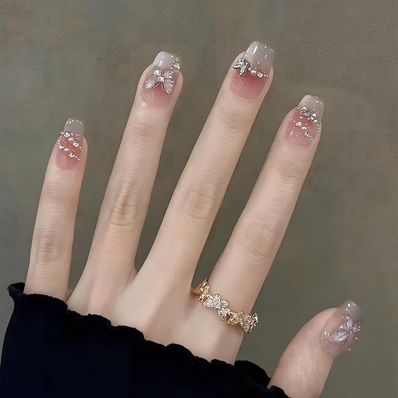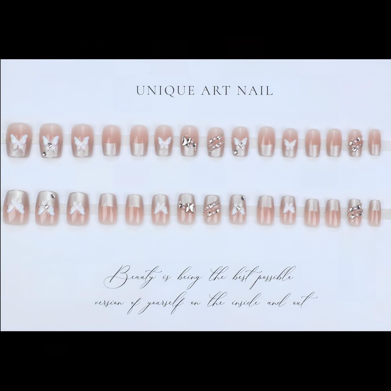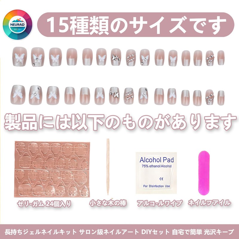 [NEURAD]ネイルチップ 30枚入マグネットタイプ インスタ風 夏限定 アイスクリアフレンチ × 浮遊3D蝶 スワロフスキー付け爪 夏向けショートネイル 人気 和風 かわいい 花嫁ネイル