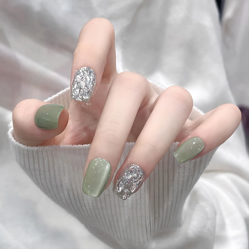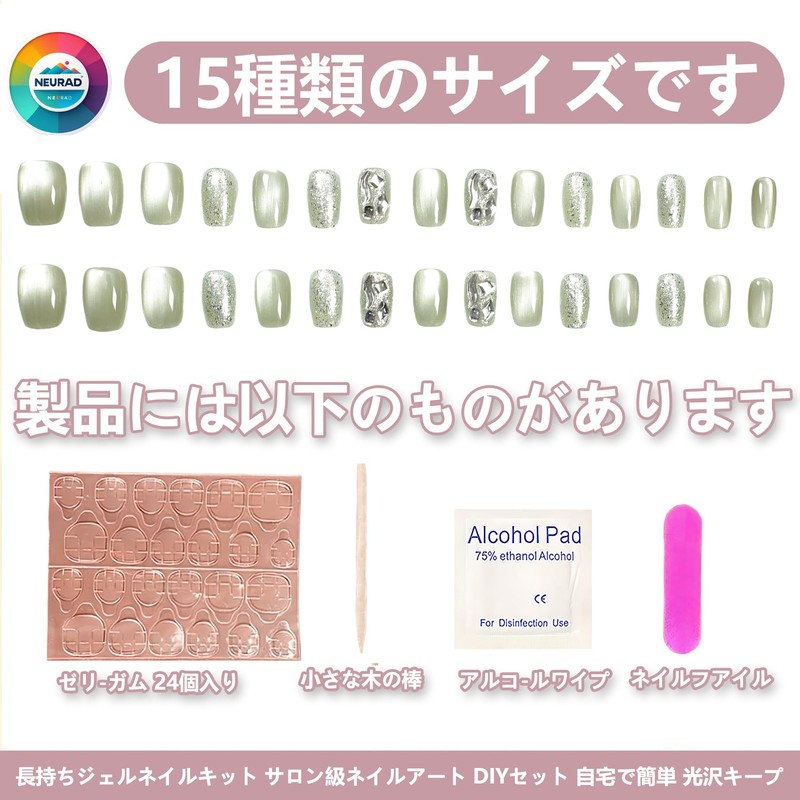 [NEURAD]ネイルチップ 30枚入マグネットタイプ マスカットミルクグリーン キャットアイ × スワロフスキー付け爪 夏向けショートネイル 人気 和風 かわいい 花嫁ネイル