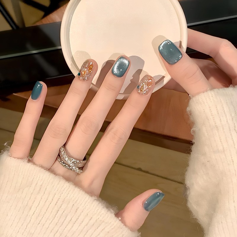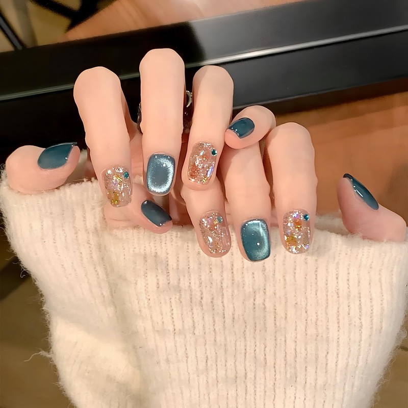[NEURAD]ネイルチップ 30枚入マグネットタイプ レイクブルーキャットアイ × スワロフスキー ショート付け爪 夏向けショートネイル 人気 和風 かわいい 花嫁ネイル
