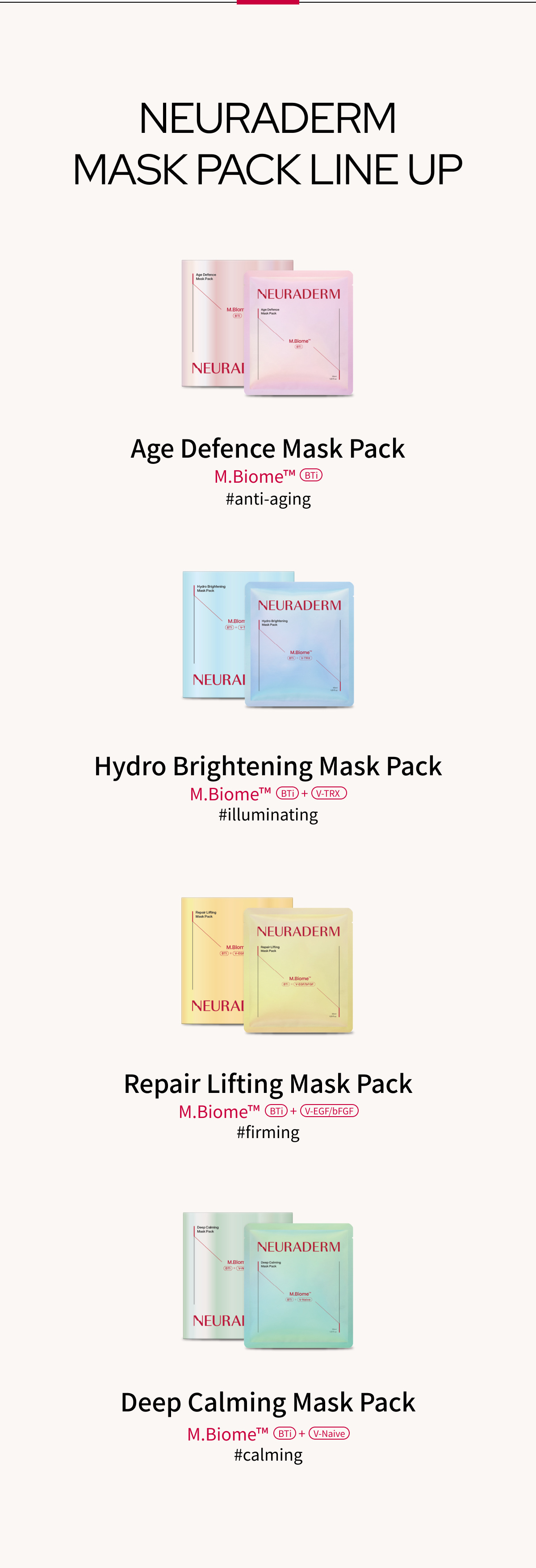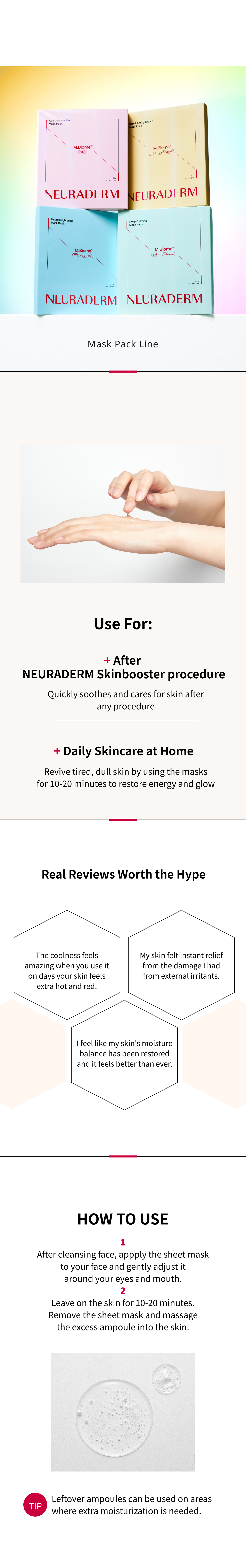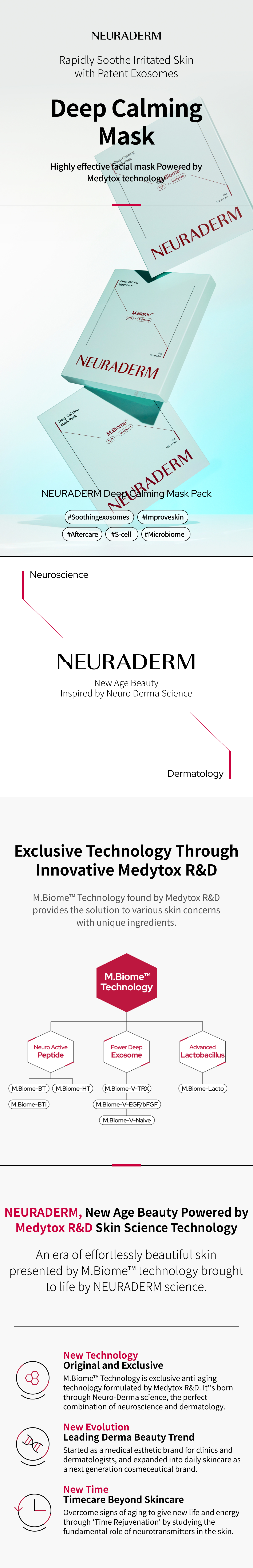 The M.Biome™ technology of NEURADERM, which studies neurotransmitters inside skin, made unique ingredients to solve various skin concerns. The patented peptide of Medytox R&D called M.Biome-BTI has become much strengthened and smarter through AI screening to provide elasticity and vitality deep inside skin. The FDA GRAS-certified yeast exosome is high efficiency active ingredient that solves various skin concerns. It is made into a capsule to provide strengthened exosome soothing effects to make healthy skin condition. The firm mucin soothing ampoule is deeply absorbed inside skin to soothe skin that is irritated from external stresses. Contains mucin soothing complex and Centella Asiatica Extract to help with skin soothing.