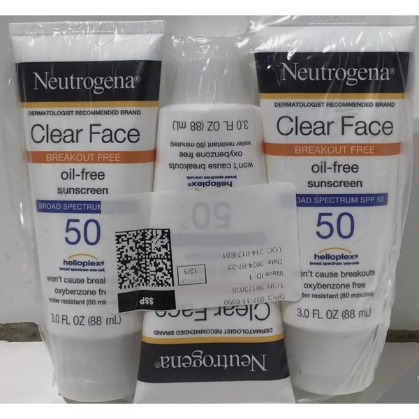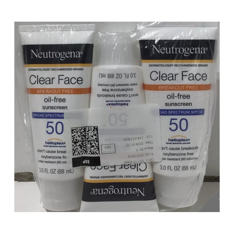 Neutrogena Clear Face Breakout-Free Sunscreen provides broad-spectrum SPF 50 protection without causing breakouts. This oil-free, fragrance-free formula is designed for acne-prone skin, offering high-level sun protection while keeping your skin clear and healthy. It is oxybenzone-free and water-resistant for up to 80 minutes, making it perfect for outdoor activities. Each bottle contains 3.0 fl oz, and this listing includes a lot of 3 for added value. Keep your skin safe and protected with this gentle, yet effective sunscreen. This lot of sunscreen is brand new and sealed.