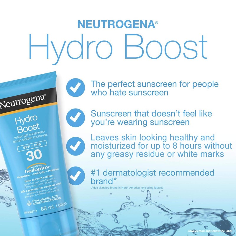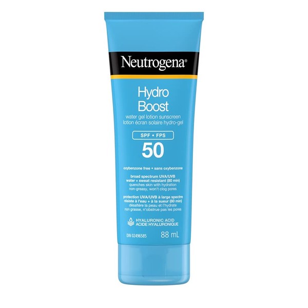 • Neutrogena Hydro Boost Water Gel lotion sunscreen SPF 50 provides Helioplex broad spectrum UVA/UVB sun protection for Face & Body