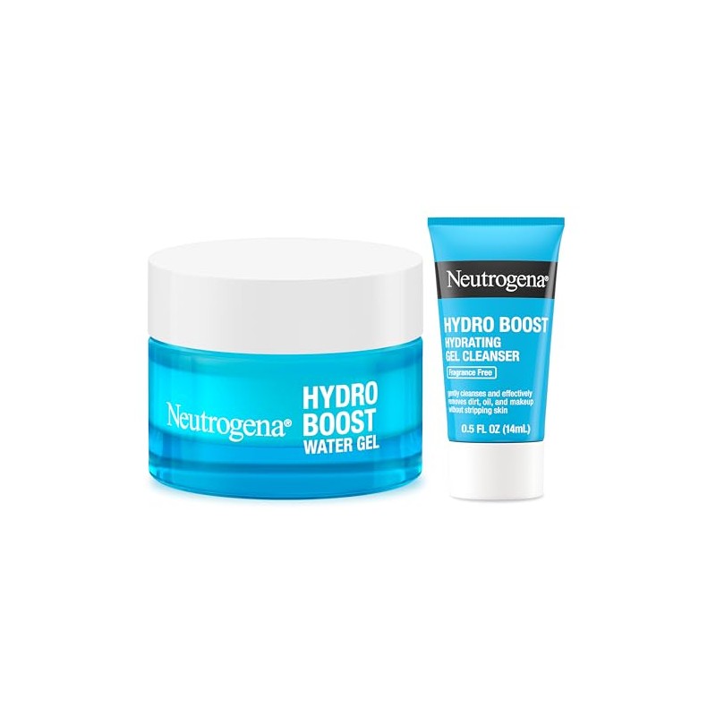 - Skincare set from Neutrogena, containing one, 1.7 ounce recyclable glass jar of Hydro Boost Fragrance Free Gel Cream Face Moisturizer & one, 0.5 ounce trial size Hydro Boost Hydrating Cleansing Gel