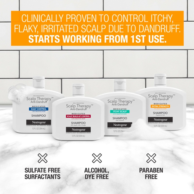 Luxurious anti-dandruff shampoo formulated with our highest 3% salicylic acid concentration. Fragrance-free, alcohol free. Salicylic acid helps remove excess oil and dead skin from the skin surface. Neutrogena Scalp Therapy? Anti-Dandruff Extra Strength shampoo penetrates deep into the skin surface to help get rid of flakes while moisturizing dry scalp. You can use the shampoo to control symptoms of dandruff, or on a regular basis to help maintain your scalp's moisture levels and help prevent recurrence of dandruff.