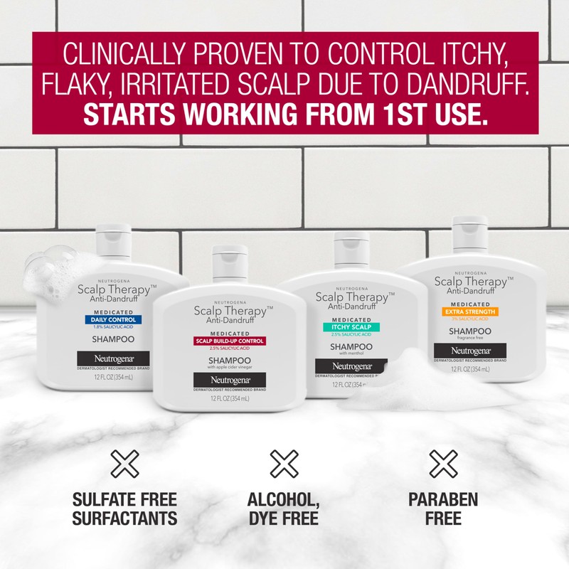 Luxurious anti-dandruff shampoo formulated with 2.5% salicylic acid and refreshing apple cider vinegar fragrance. Salicylic acid helps remove excess oil and dead skin from the skin surface. Neutrogena Scalp Therapy? Anti-Dandruff Scalp Build-Up Control shampoo penetrates deep into the skin surface to help get rid of flakes while moisturizing dry scalp. You can use the shampoo to control symptoms of dandruff, or on a regular basis to help maintain your scalps moisture levels and help prevent recurrence of dandruff.