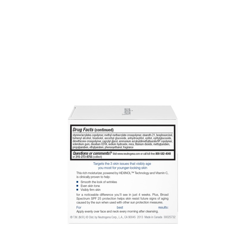 Use Neutrogena Triple Age Repair Daily Facial Moisturizer Cream with SPF 25 Sunscreen to tackle wrinkles, uneven tone and loss of skin resilience. Our anti-aging face moisturizer targets the three skin issues that age you the most for a difference you can see in just four weeks. Made with vitamin C, shea butter and glycerin, this daily anti-wrinkle cream features Hexinol technology and is clinically proven to help smooth the look of wrinkles, even skin tone, reduce the appearance of dark spots, and visibly firm skin. The anti-aging formula of this neck and face cream also contains broad spectrum SPF 25 sunscreen protection against UVA & UVB rays to help prevent the premature signs of skin aging caused by the sun. Apply this anti-wrinkle moisturizer evenly over face and neck every morning after cleansing for best results. Suitable for everyday use in a regular skincare routine, this wrinkle cream turns at-home hydration of dry skin into a self-care experience.