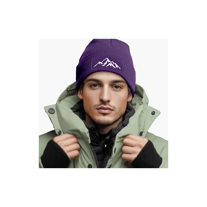 Neverless® Men's Beanie Winter Hat with Patch Mountains Nature Outdoor Print Knitted Hat Ribbed Knit, purple