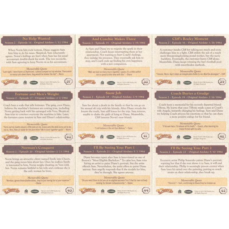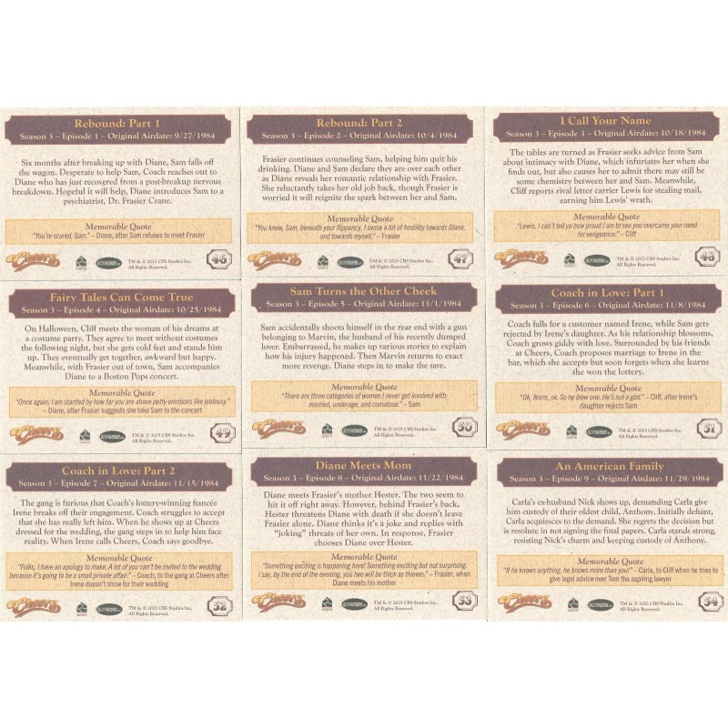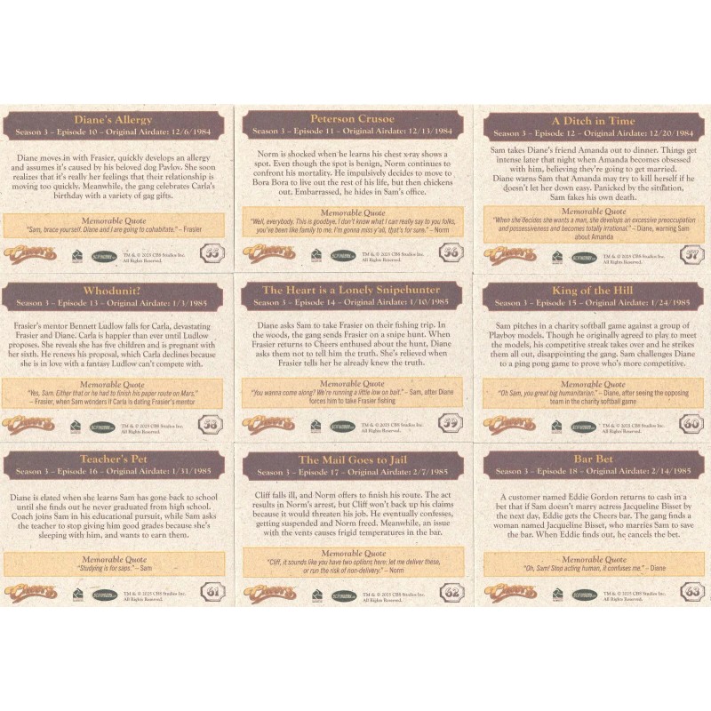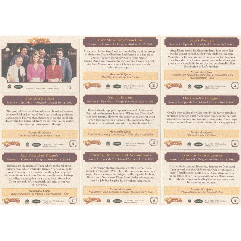 YOU ARE BIDDING ON THE FOLLOWING, (1) COMPLETE 99 CARD BASE SET FOR THE SET OF CHEER'S SEASON 1-4. AS AN ADDED BONUS I WILL THROW IN 2 EMPTY WRAPPER'S FROM THE SET. CARDS ARE NEAR MINT TO MINT CONDITION AND SHIP IN A PLASTIC HARD CASE TO HELP PROTECT THEM. SEE MY OTHER AUCTIONS FOR OTHER BINDERS, PROMOS AND CHASE CARDS. WINNING BIDDER TO PAY BY VIA eBay Pay PLUS $7.95 FOR USPS GROUND ADVANTAGE MAIL SHIPPING & HANDLING FOR THE 1ST SET, ADD $.50 FOR EACH ADDITIONAL SET. USE THE “CONTACT SELLER” LINK IF YOU HAVE ANY QUESTIONS. I HAVE THOUSANDS OF NON SPORT SINGLES AND A LOT OF VARIOUS CHASE CARDS. PLEASE CHECK OUT MY OTHER AUCTIONS OR MY EBAY STORE. THANKS FOR LOOKING!