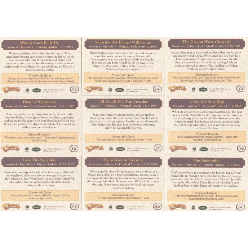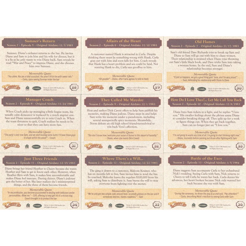 • Character: Sam Malone, Diane Chambers, Carla Tortelli, Cliff Clavin, Norm Peterson, Dr. Frasier Crane, Woody Boyd