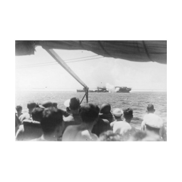 - Description - A torpedo from the U.S. Navy destroyer USS Whipple explodes against the side of USS Langley. The destroyer was attempting to sink the stricken ship, which had been attacked by Japanese bombers, lest she fall into enemy hands.