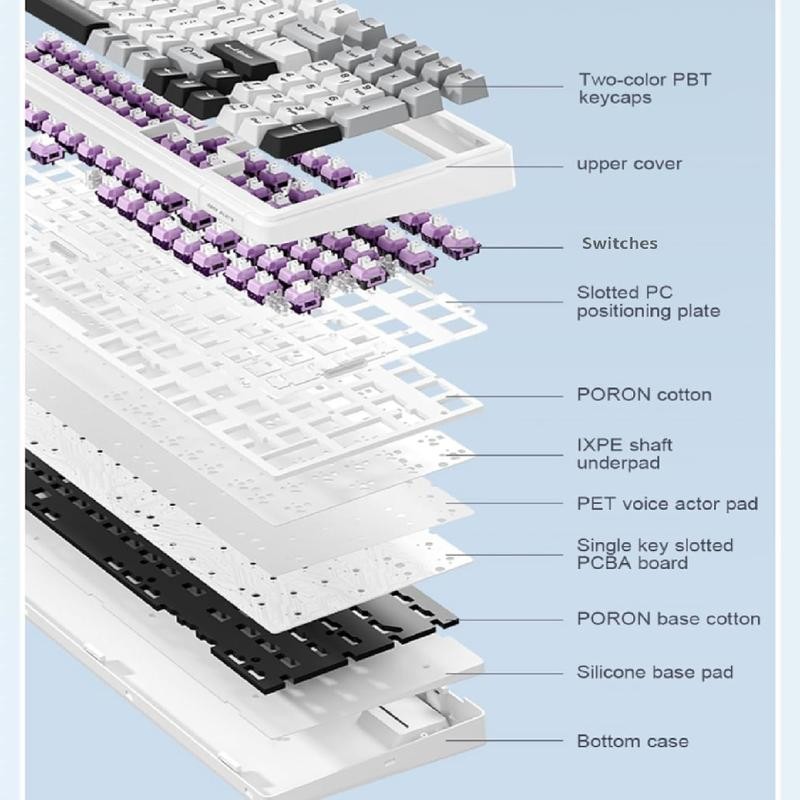 • Creamy Keyboard: Equipped with 5-layers of sound deadening material to enhance typing sound. The combination of sandwich foam, IXPE switch pads, PET acoustic membrane, bottom foam, and silicone protector pads help eliminate echoes, providing a pure typing sound and a stable, comfortable typing feel