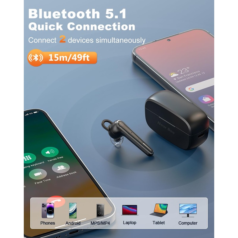 New bee Bluetooth Headset V5.1 Dual ENC Mic Bluetooth Earpiece Handsfree with 500mAh Charging Case 50Hrs Play Time Hands Free Headset for Driving/Business/Office with Android iOS Laptop