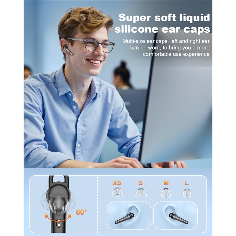 • Comfortable Wearing Design: Our handsfree bluetooth headset (8.2g) is crafted with an ergonomic design, 60° adjustable earbud ensures a perfect fit for either your left or right ear. The hands free earpiece with liquid silicone earplugs supports more soft and not easy to fall off, and there are 4 sizes of ear tips and ear hooks (XS/S/M/L) to choose from for a perfect fit. The ultra-lightweight design minimizes ear strain, offering lasting comfort for extended use.
