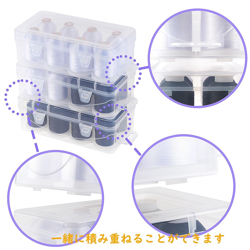 - ★ STACKABLE AND HANGABLE CLEAR PLASTIC STORAGE BOX: All these spools are neatly organized in a plastic storage box. Made of high quality clear plastic material, the storage box allows you to easily identify the color and number of threads from the outside. Besides spooling, you can also store small embroidery, sewing accessories and other sewing tools. The boxes are stackable so you can organize your threads and accessories more appropriately and save space in your sewing room. You can also hang the storage box on the wall with the convenient hooks
