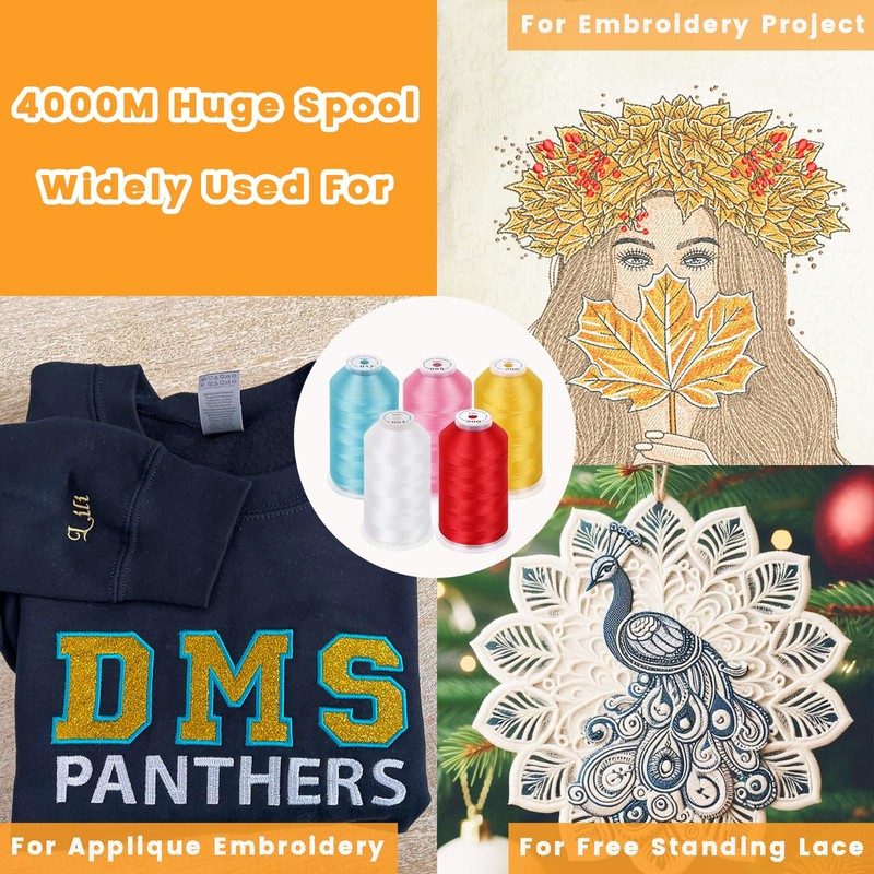 - ★★ Ideal Weight and HUGE SPOOL - Each Spool has 40 W.T.(120D/2) and 4000M(4400Y) length, which makes these spools of Polyester Embroidery Machine Thread ideal for All Embroidery Machines including Commercial, Semi-industrial and Home based Embroidery Machines. (Note: home based machine user MUST use thread stand (holder) to help feeding threads to machine properly!)