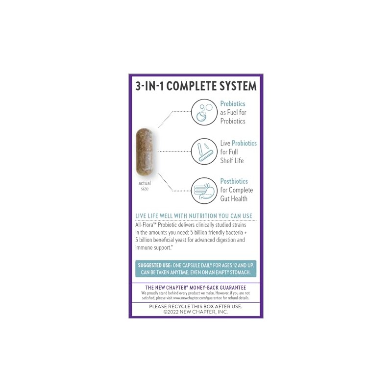 It's time to rethink probiotic supplements, and seek not just the right amounts of live probiotics for gut health, but also the key fuel and compounds they'll need along the way. New Chapter?'s Probiotic All-Flora is an advanced formula that harnesses the power of clinically studied probiotics + prebiotics + postbiotics from New Chapter's signature fermented herbs. Delivers everything you need to nourish inner wellness: prebiotics as fuel for good bacteria, clinically studied live probiotics for advanced digestion and immune support, and postbiotics for complete gut health.* You can count on these clinically studied probiotics to be DNA-tested to assure quality and identity, giving you the exact, researched strains every time. *These statements have not been evaluated by the Food and Drug Administration. This product is not intended to diagnose, treat, cure, or prevent any disease.