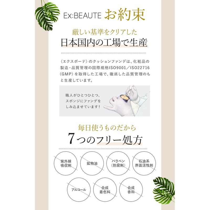 - Made in Japan: All Exoute cushion foundations are produced in a domestic factory that has acquired international standards of ISO 9001 and ISO 22716 (GMP) for manufacturing and quality control. Each artisan infuses the foundation into the sponge