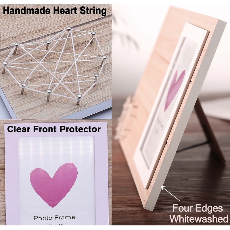 - Material: Made of high density wood, handmade string twine heart design (made with cotton lines and nails); The texture of each photo frame is unique; Clear front protector can protect your photo and allow you to have a great view of your photo